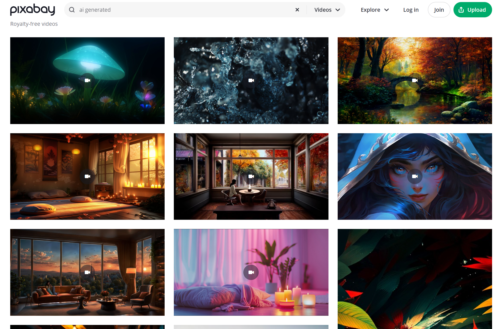 동영상 생성은 기술적으로 가장 까다로운 영역이지만, 여기서도 사전 생성된 콘텐츠를 제공하는 움직임이 보인다. Pixabay는 ‘AI generated’ 키워드로 수천 편의 무료 동영상을 제공하고 있으며, 이는 상업적 프로젝트에도 사용할 수 있다. OpenAI의 Sora 역시 공개된 예시 영상을 통해 AI 비디오의 가능성을 체험할 수 있도록 하고 있다. 아직은 규모가 제한적이지만, 앞으로 대량의 AI 영상 콘텐츠를 모아두는 전문 플랫폼이 나타날 가능성이 높다.