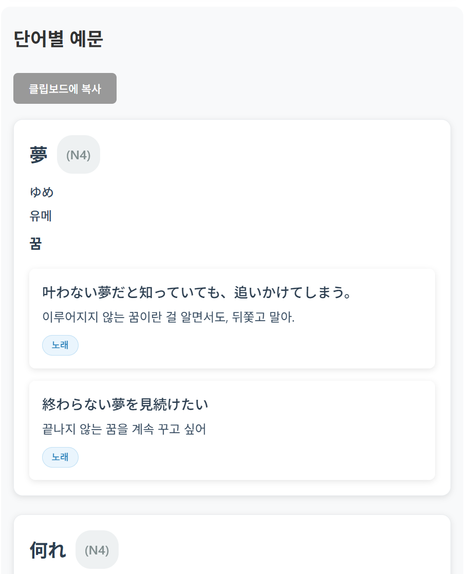 일본 노래 가사를 기반으로, 개인의 학습 목적과 수준에 맞춰 동적으로 생성되는 맞춤형 일본어 학습 경험을 제공하는 웹/앱 서비스. - jaehakl/onigiri