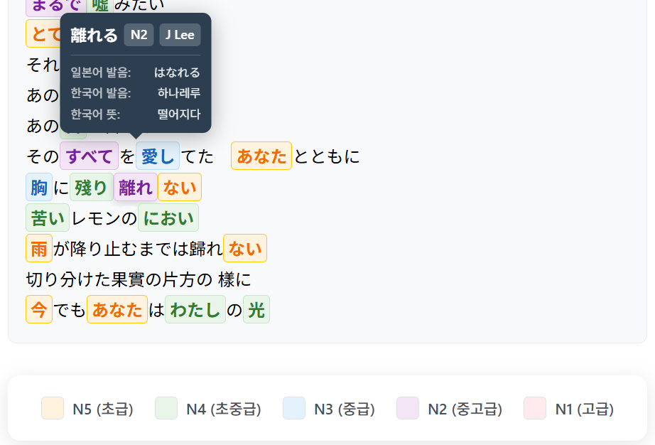 • 가사 속 단어가 분석되어 색상으로 난이도가 표시됩니다.