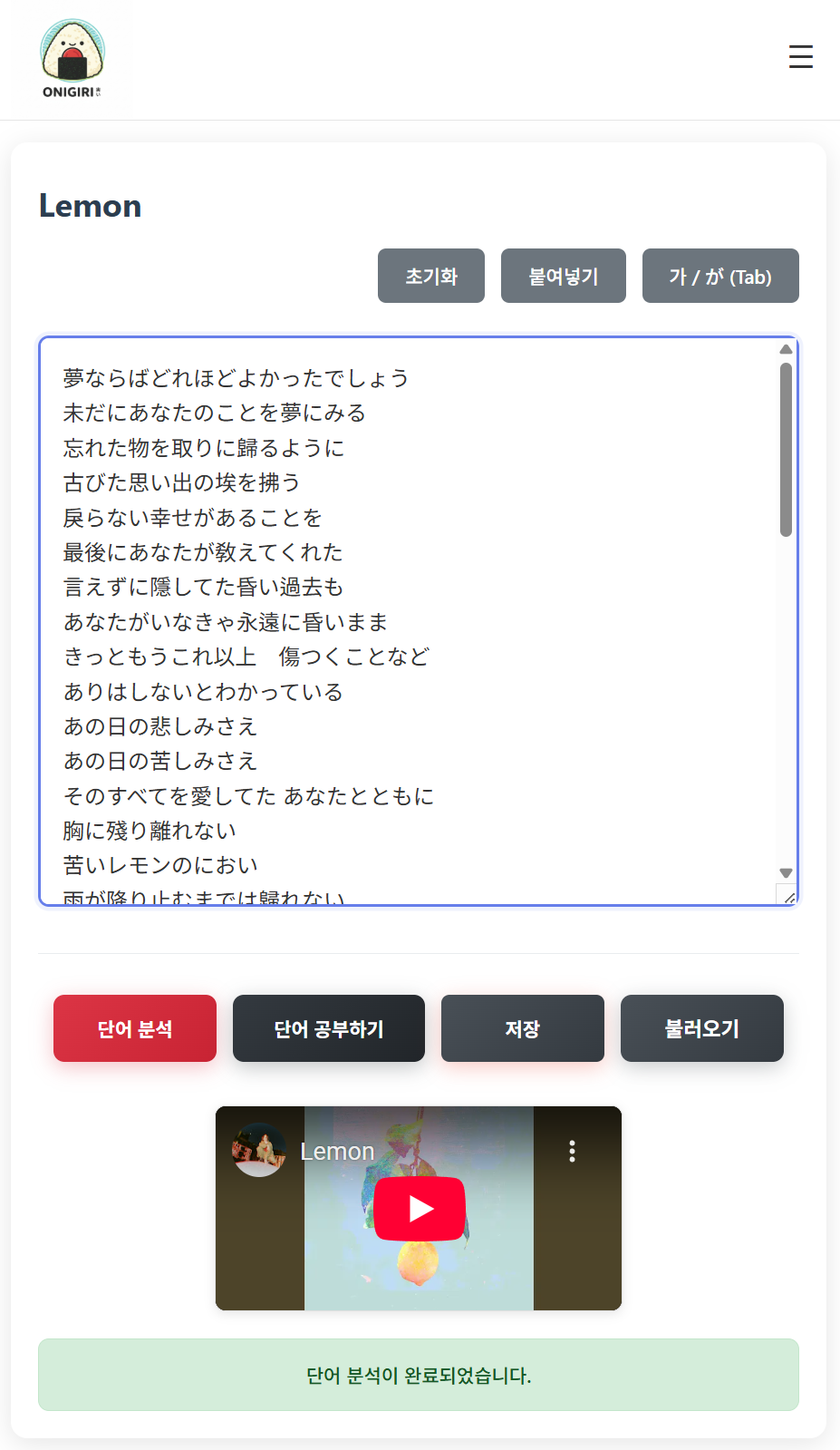 Onigiri는 일본 노래 가사 한 곡을 나만의 맞춤 교재로 바꿔주는 서비스입니다.